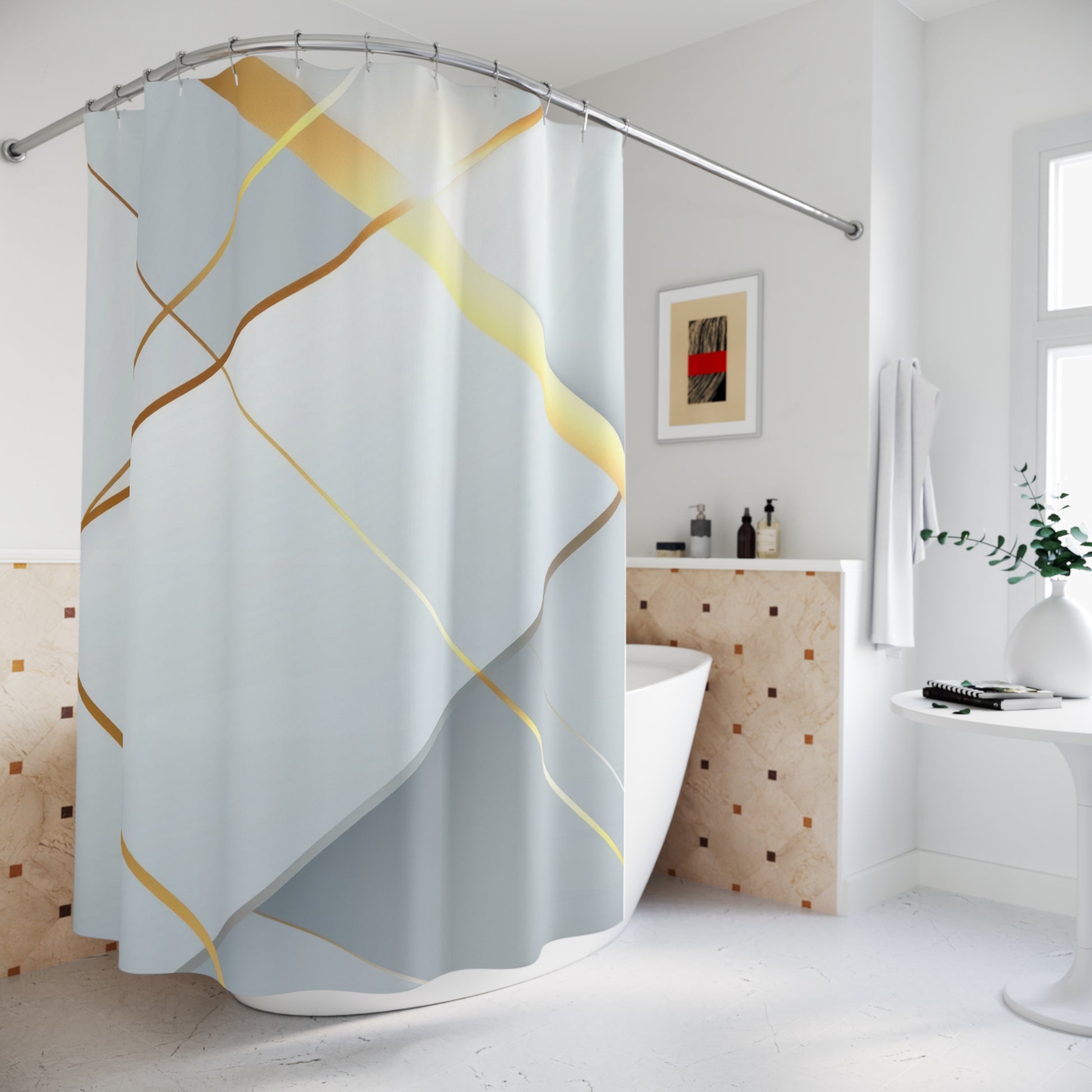 This shower curtain is here to add an original touch to any bathroom with your designs. Made with highly durable polyester, this curtain stays like new for a long time to come and is a perfect printing area for your art. Please note: While polyester offers adequate protection against water, a liner might be necessary for full waterproofness.